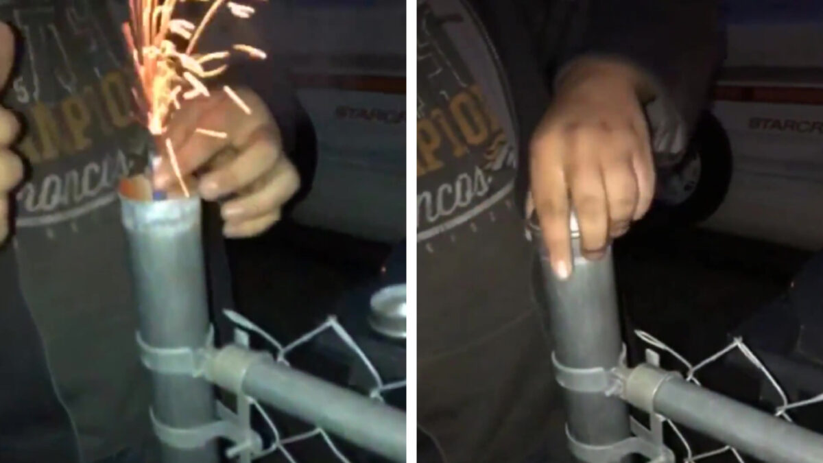 Pyro-stunter stopt metalen paal vol met vuurwerk