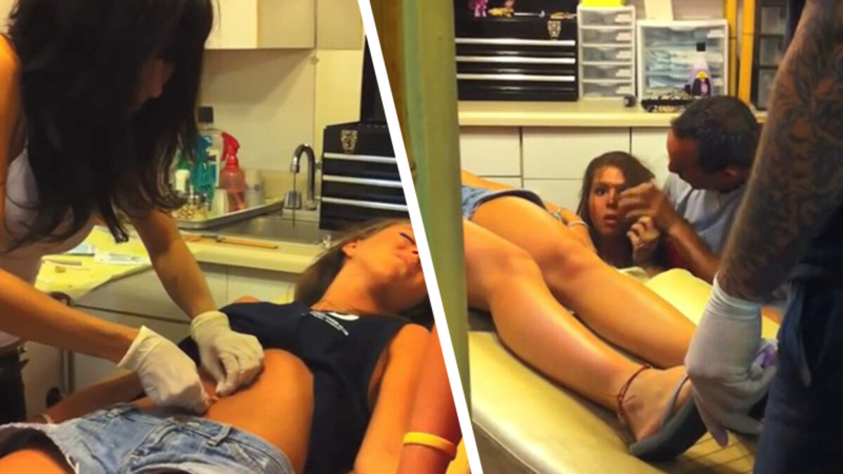 Juffie gaat knock-out als haar vriendin een piercing laat zetten