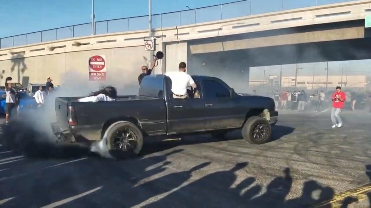 Laadklep van pick-up begeeft het als showbal donuts maakt met zijn vriendin achterin