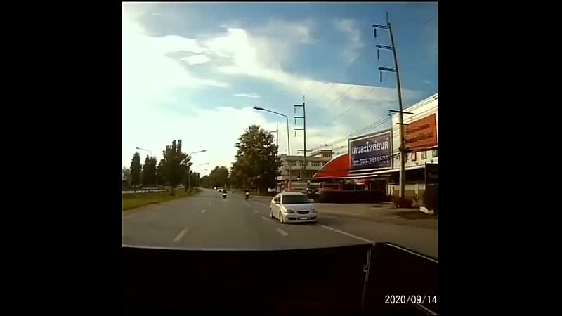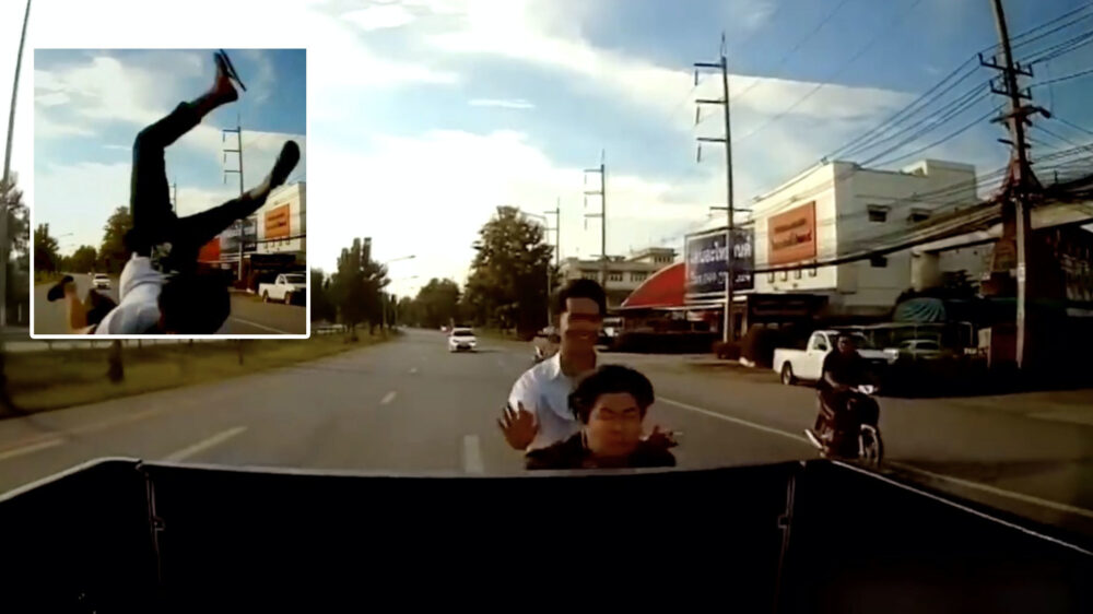 Thaise motorbink klapt op pickup, maakt salto en belandt achterin de auto