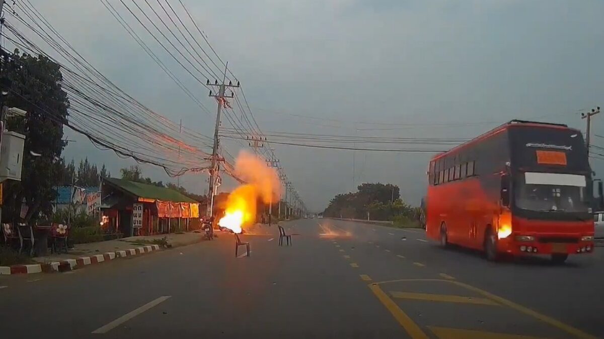Een Thaise motorrijder en zijn mattie worden getrakteerd op een elektrische schok als ze over een kapotte stroomkabel rijden die door blikseminslag is getroffen.