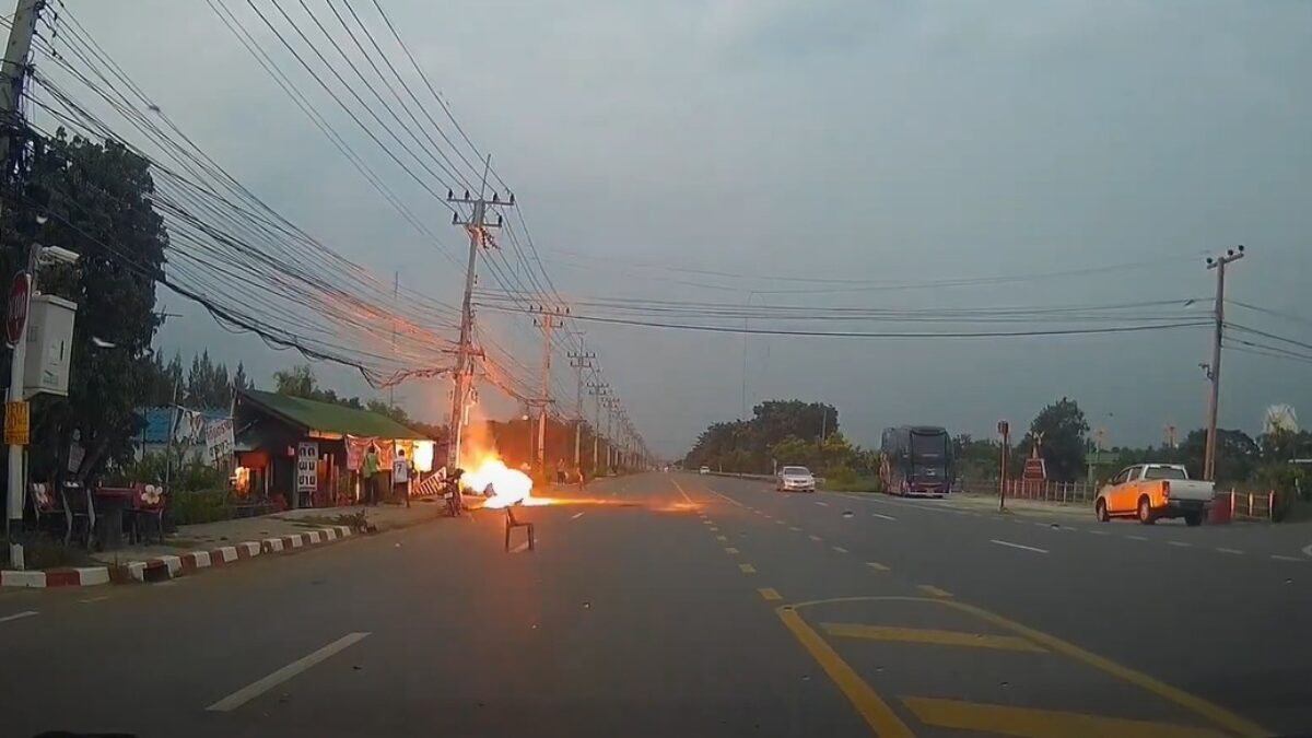Een Thaise motorrijder en zijn mattie worden getrakteerd op een elektrische schok als ze over een kapotte stroomkabel rijden die door blikseminslag is getroffen.