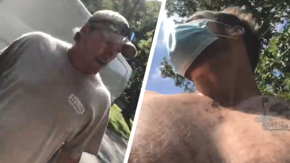 Betweterige shirtloze fietser wil een automobilist even de oren wassen