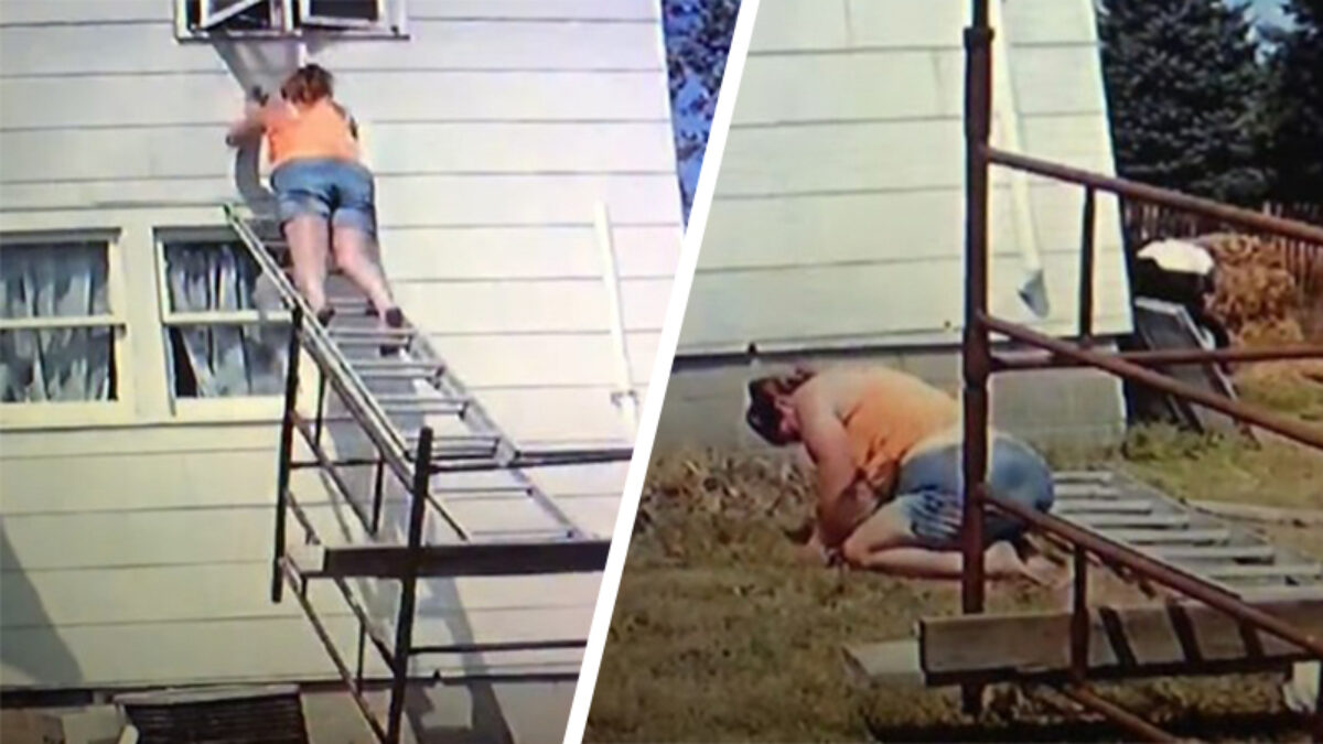 Ze maakt een flinke smak als ze van de ladder afklettert en moet even haar momentje pakken. Waarom vrouwen langer leven gaat hier niet echt op 😁😂