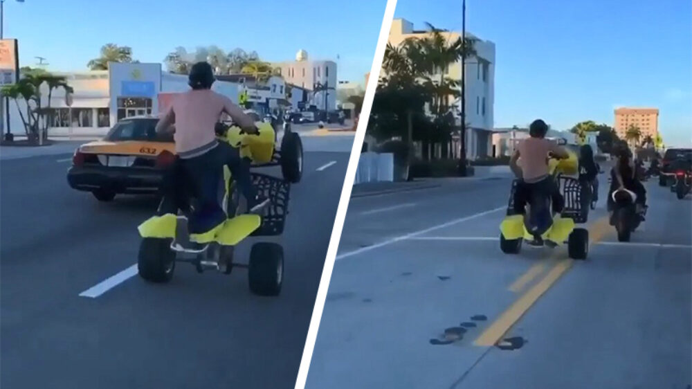 Shirtloze quadrijder slooft zich uit en beukt motorrijder ondersteboven
