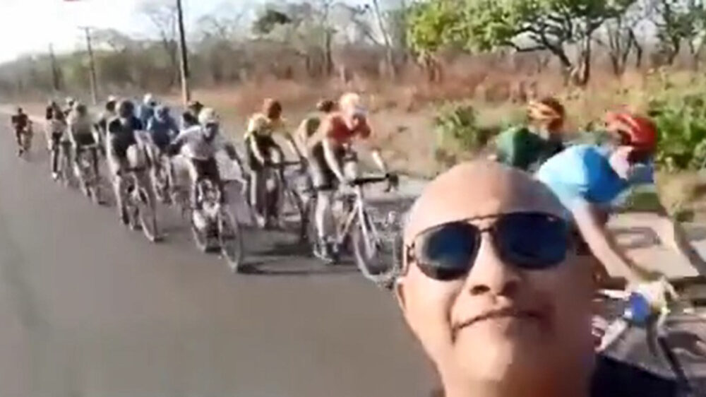 Wielerverslaggever krijgt tijdens zijn reportage een soort van schouderklopje