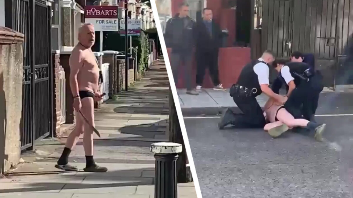 Machetemafkees in onderbroek wordt door politie in Londen naar de grond gewerkt