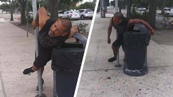 Pechvogel zit hartstikke klem tussen een verkeerspaal en een prullenbak