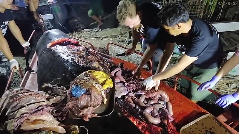 Niet echt de meest smakelijke beelden om naar te kijken, maar dat dit beestje vol zat met zo'n 40 kilo (!) plastic is toch wel heftig.
