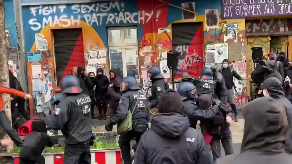 Het kraakpand Liebig34 aan de Liebigstrasse in Berlijn is beroemd en berucht, maar vanmorgen vond een rechter het daar welletjes en besloot tot ontruiming. Daar waren de linkse activisten het natuurlijk niet mee eens en de actie mondde uit in een flinke vechtpartij.