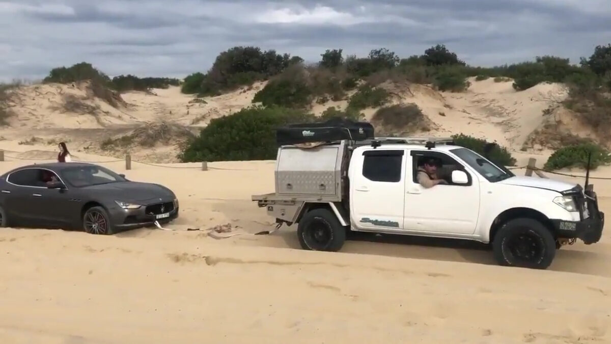 De meeste mensen hebben wel het benul dat als ze een auto slepen, ze niet als een malle weg moeten jagen maar langzaam de kabel op spanning moeten laten komen en voorzichtig weg moeten rijden. Deze sleepkneus niet, en als extra pech betreft het ook geen lullig autootje maar een dikke Maserati.