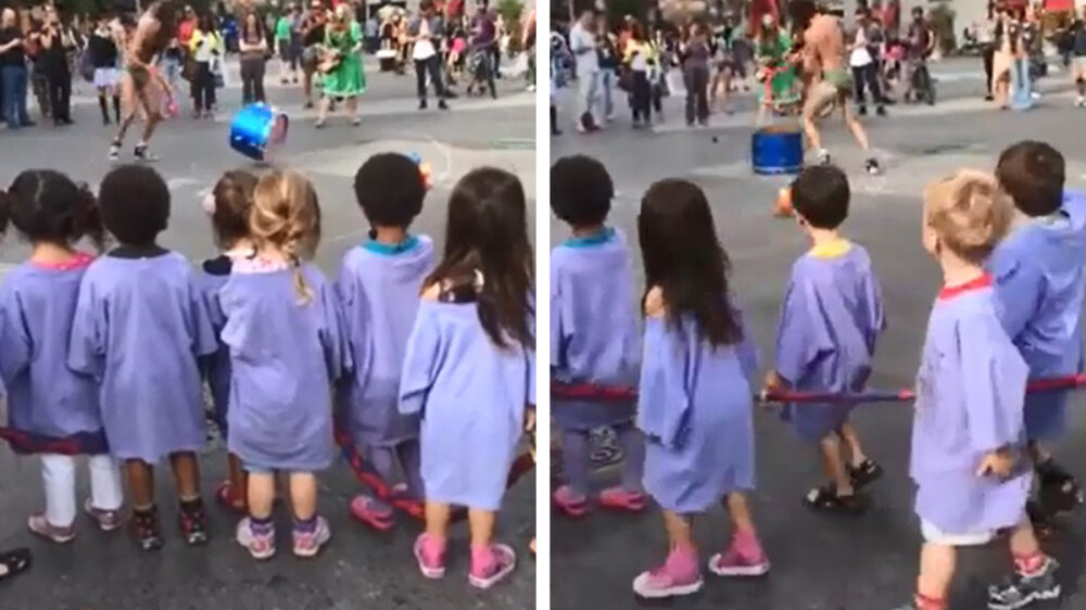"Kijk kinderen, zo eindig je als je niet je best doet op school. Loop maar door dan nemen we een kijkje bij Benno de zwerver."