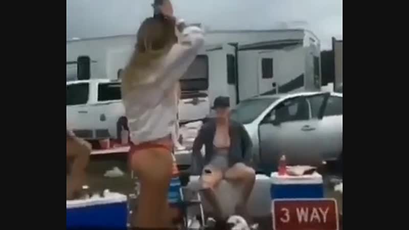 Campingdarter probeert blikje bier van chick d’r hoofd te gooien Fun