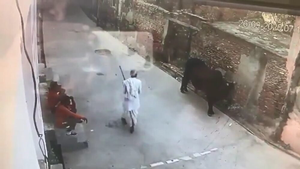 Bejaarde man wordt gelanceerd als hij een stier met een stok slaat