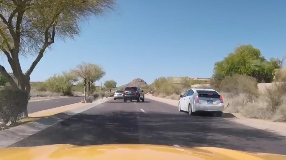 Instant karma voor een automobilist die door het verkeer zigzagt