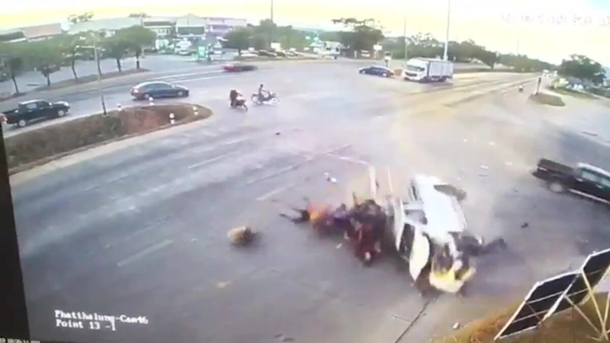 In Thailand, waar deze klapper plaatsvond, is dit een redelijk normale manier van persoonsvervoer: met z'n allen achterop een pickup. Er raakte wonderwel niemand zwaar gewond.