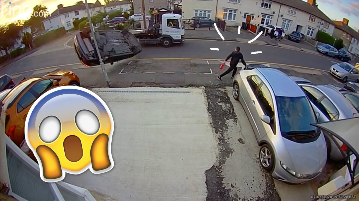 Keurig op de stoep, rustige wijk, wat kan je als wandelaar overkomen? Nou, een inhalende Audi kan wel eens een beuk krijgen van een #sleepwagen waardoor je moet rennen voor je leven. Die kan naar huis om zich te verschonen, gegarandeerd.