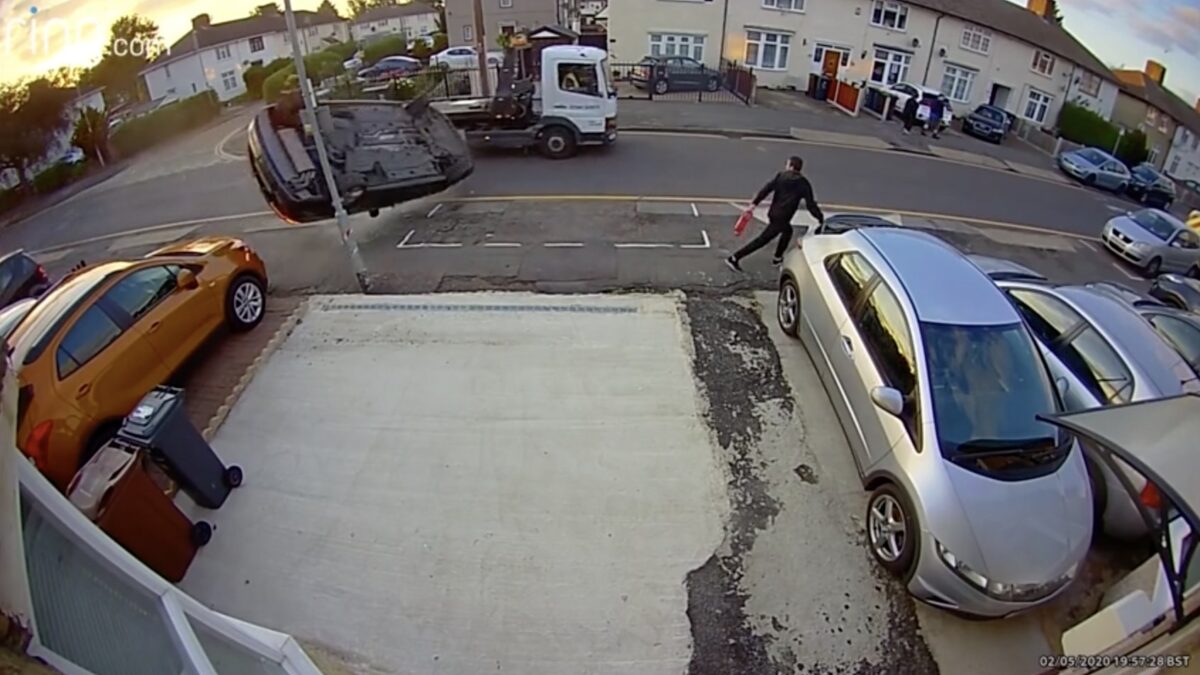 Keurig op de stoep, rustige wijk, wat kan je als wandelaar overkomen? Nou, een inhalende Audi kan wel eens een beuk krijgen van een #sleepwagen waardoor je moet rennen voor je leven. Die kan naar huis om zich te verschonen, gegarandeerd.