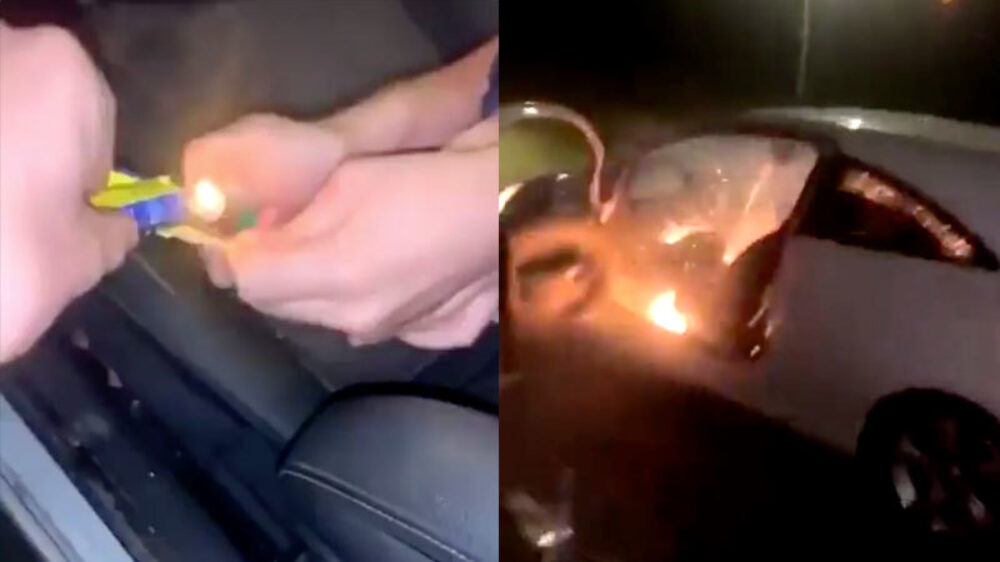 We hebben weer een nieuwe inzending voor de Darwin Awards. De filmer is tenminste nog op tijd uit zijn auto, maar zijn mattie zo te horen niet.