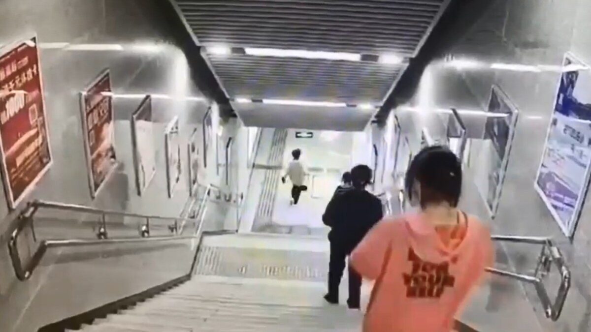 Een Chinese vrouw is druk in de weer met d'r telefoon om de laatste #fails op haar favoriete website (*kuch* Skoften *kuch*) te checken terwijl ze een trap nadert. Ho Lee Fuk als dat maar goed gaat!