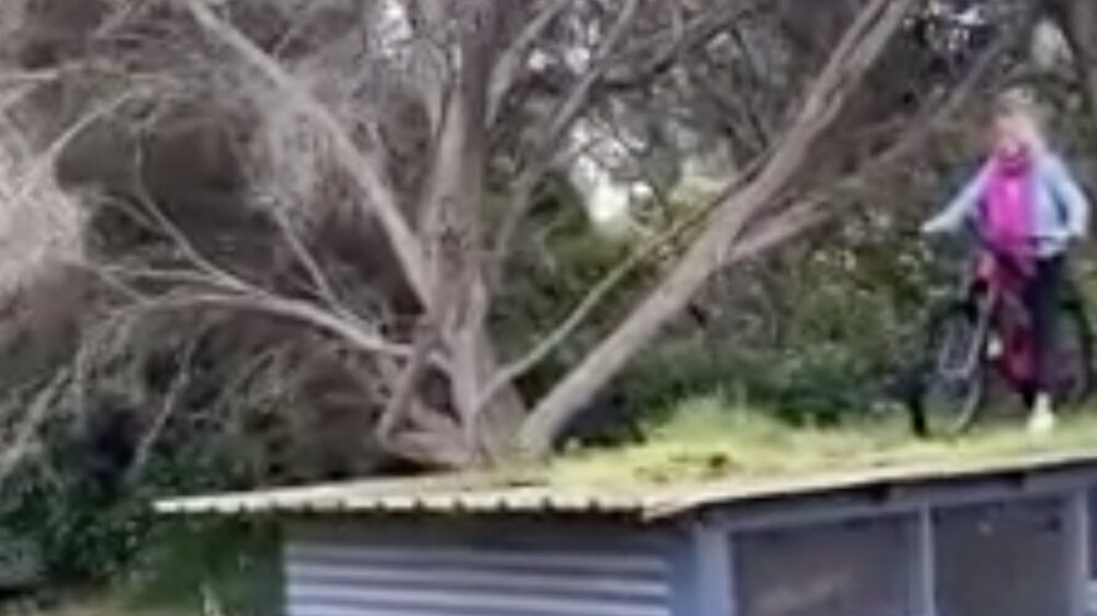 Vrouw klapt vol op d'r plaat als ze van schuurtje fietst