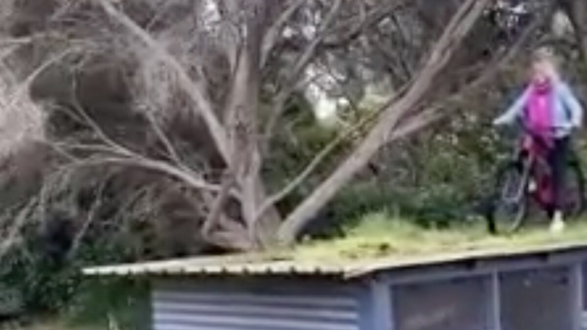 Vrouw klapt vol op d'r plaat als ze van schuurtje fietst Fails
