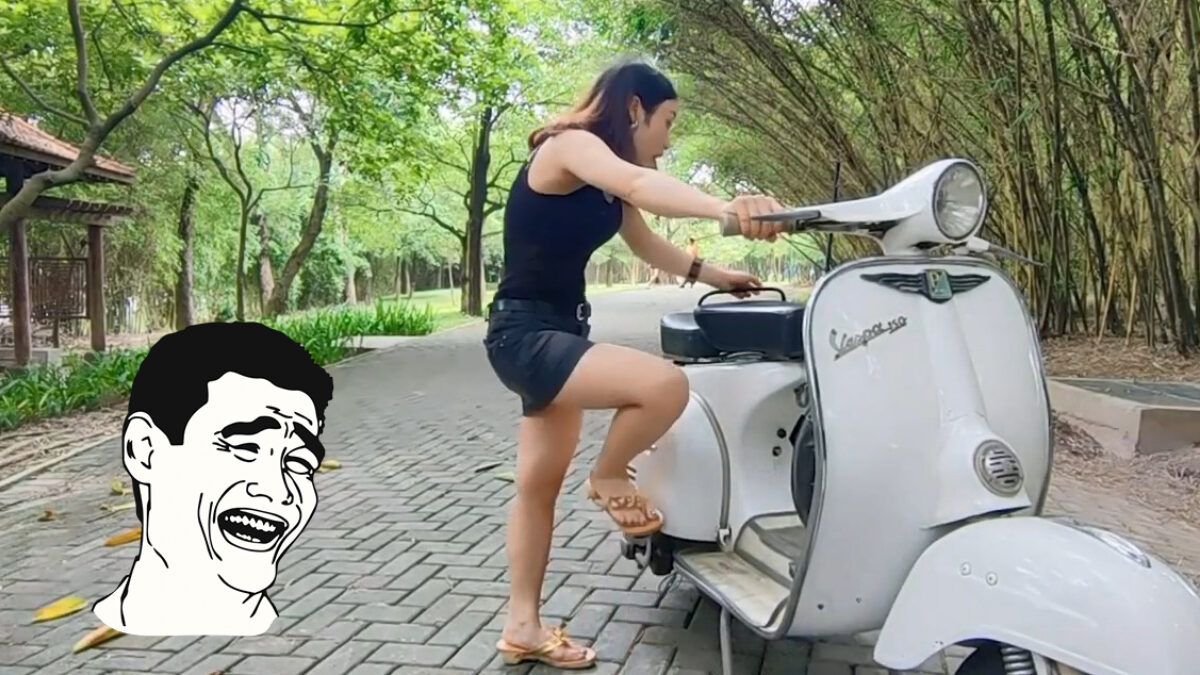 Kleine Thaise tante krijgt haar GROTE Vespa met veel moeite gestart Fails