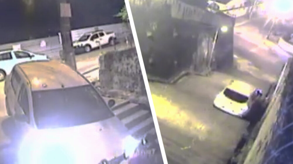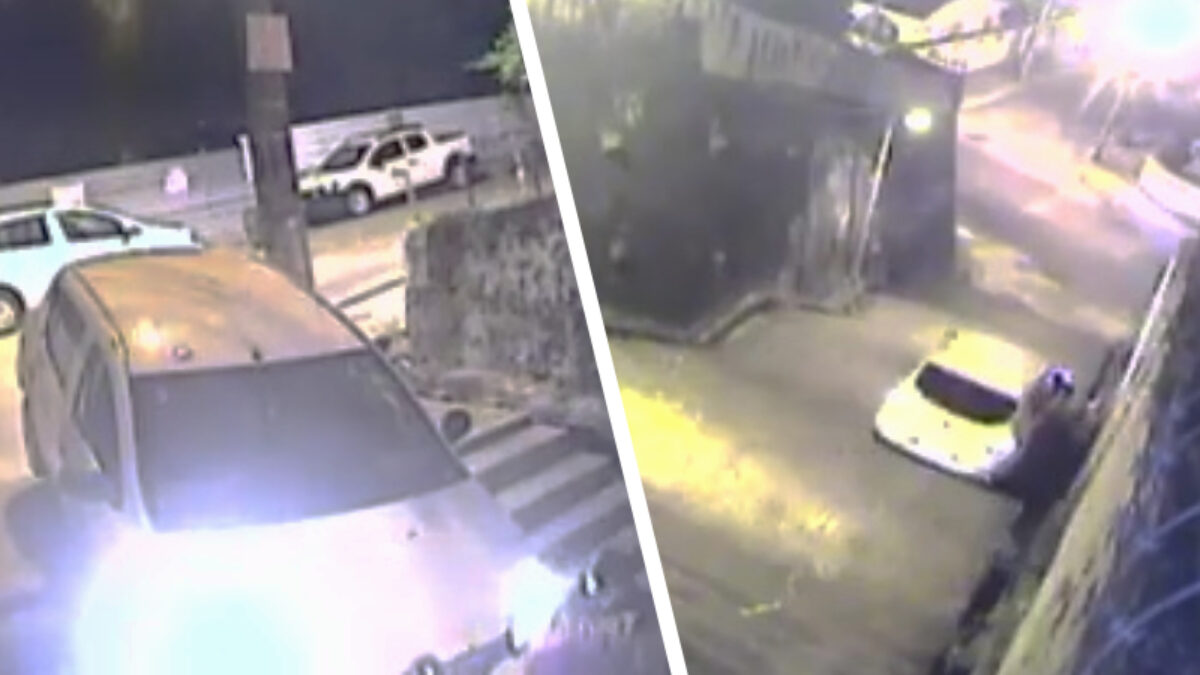 Vrouwelijke bestuurder parkeert op een trap, vergeet handrem en schrijft auto af