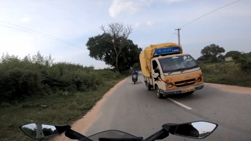 We hebben hier wel te maken met de potentiële winnaar van de 'close call van de week-award'. De tegenligger mag God/Allah/Koe op zijn blote knietjes bedanken dat het een motor en geen auto is die hem tegemoet komt.