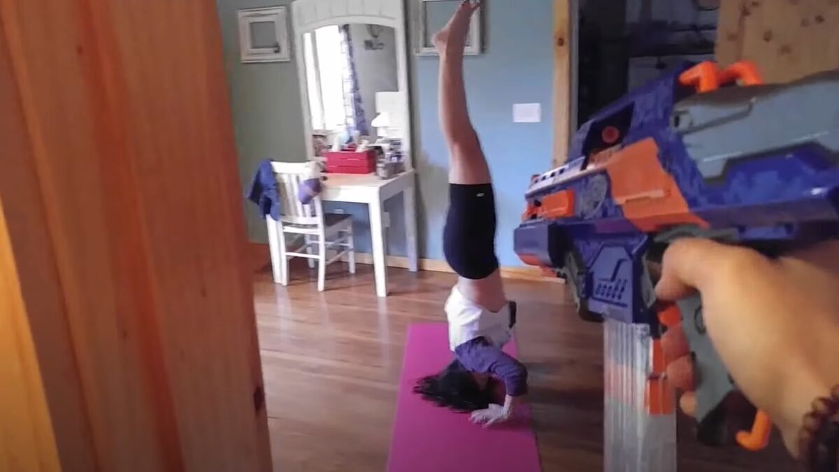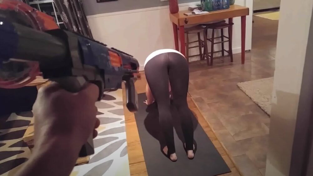 We hebben deze lolbroek met zijn nerfgun al vaker voorbij zijn komen, maar hij weet nog altijd het bloed onder de nagels van zijn (nu nog) vrouw vandaan te halen.