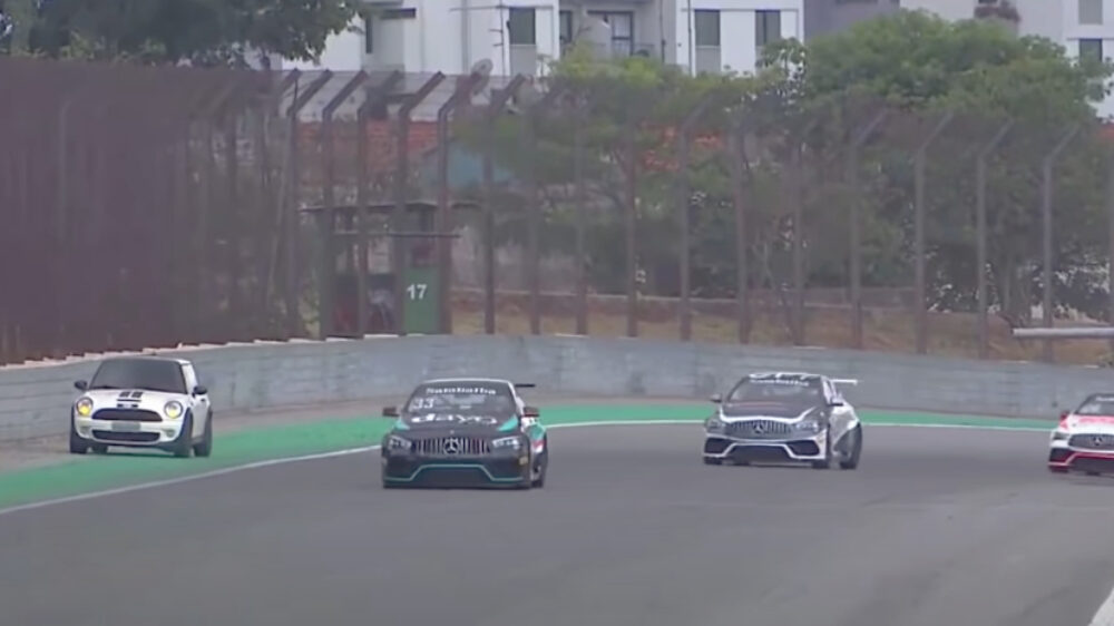 Toch op z'n minst bijzonder als je tijdens een race in het São Paulo Motor Racing Championship ineens te maken krijgt met een onverwachte tegenstander: een Mini Cooper. Best apart tussen de bloedsnelle Mercedessen en dus werd er al snel met de gele vlag gezwaaid en kwam de safety car in de baan.