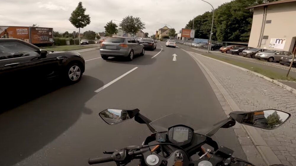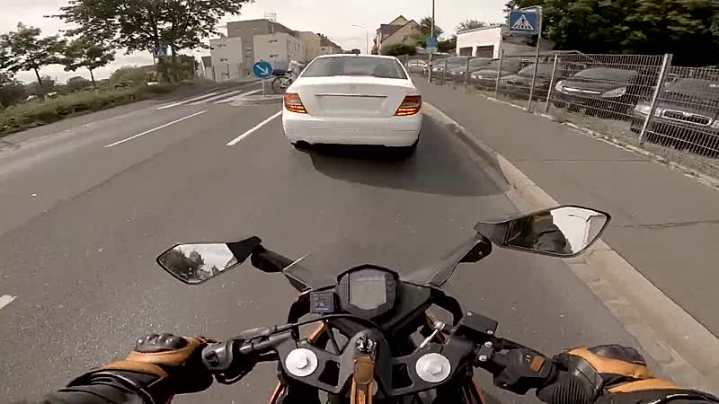 Meneertje Mercedes moet voor het zebrapad afremmen maar dat heeft de oplettende Motorradfahrer niet helemaal op tijd in de gaten. Scheisse!