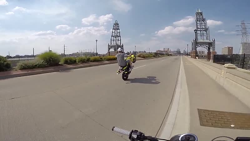 Motorbink gaat op zijn plaat tijdens het uitsloven voor zijn homeboys
