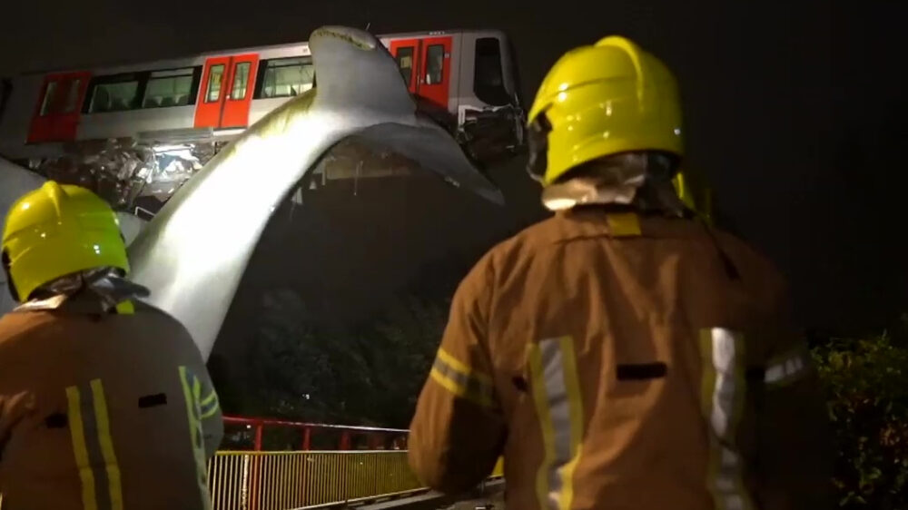 Metro knalt in Spijkenisse dwars door stopblok en hangt nu metershoog boven de weg