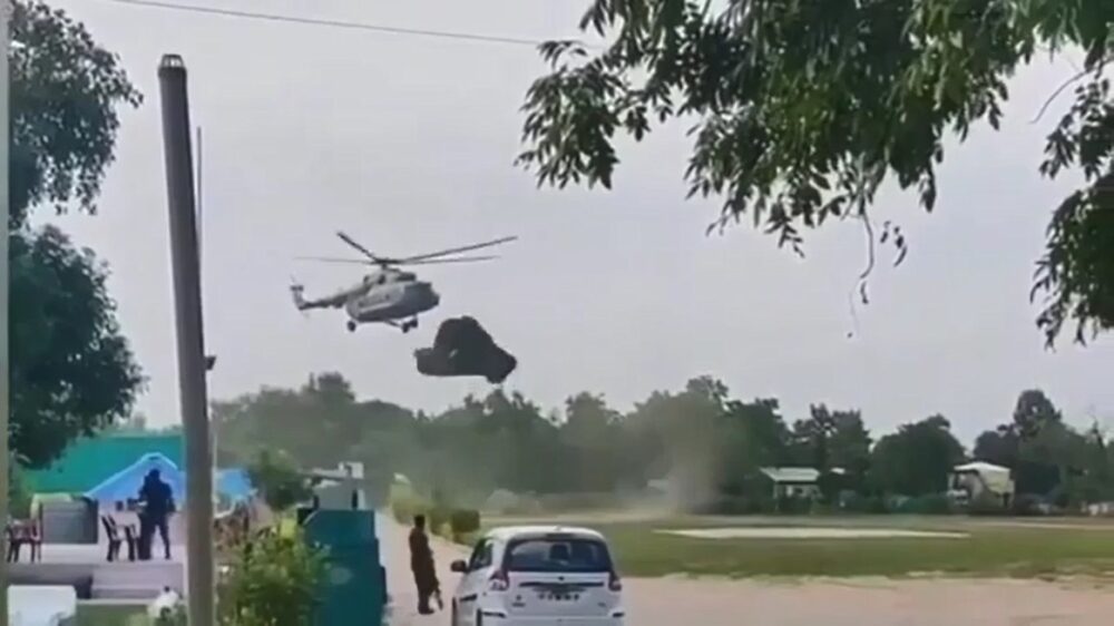 Een helikopter in India krijgt tijdens het landen te maken met een dekzeil tussen zijn rotoren en besluit er korte metten mee te maken. Chopper wordt shredder.