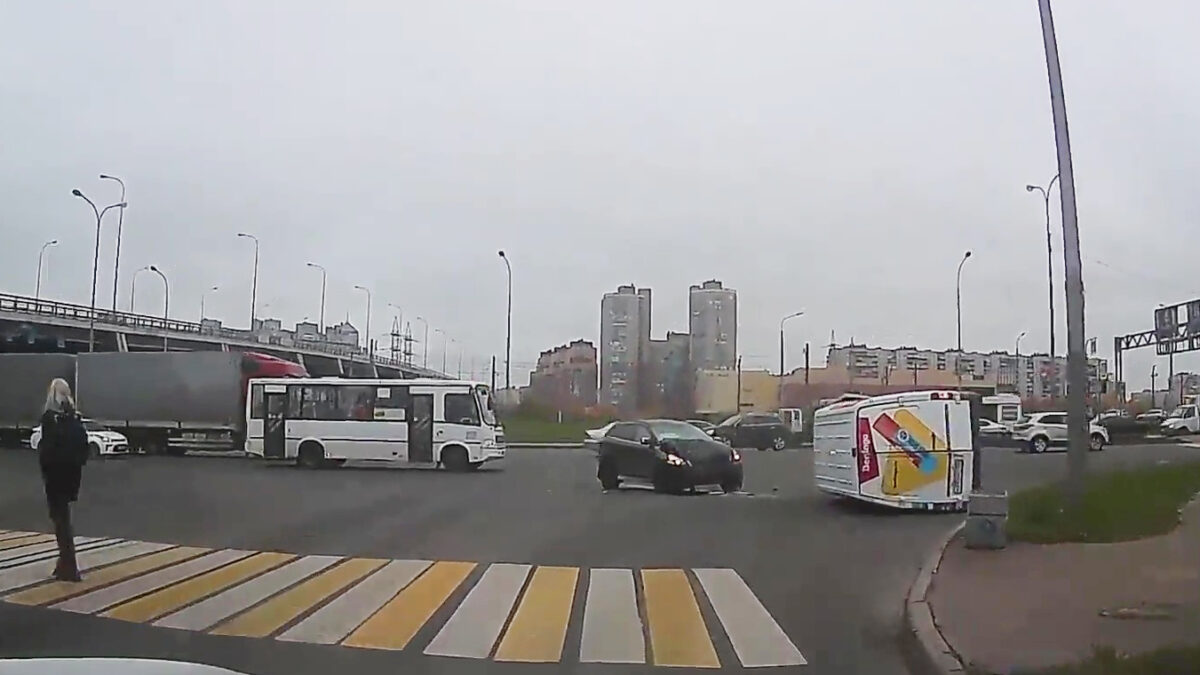 Russisch busje gaat op z'n kantje nadat tegenligger in zijn zijkant knalt