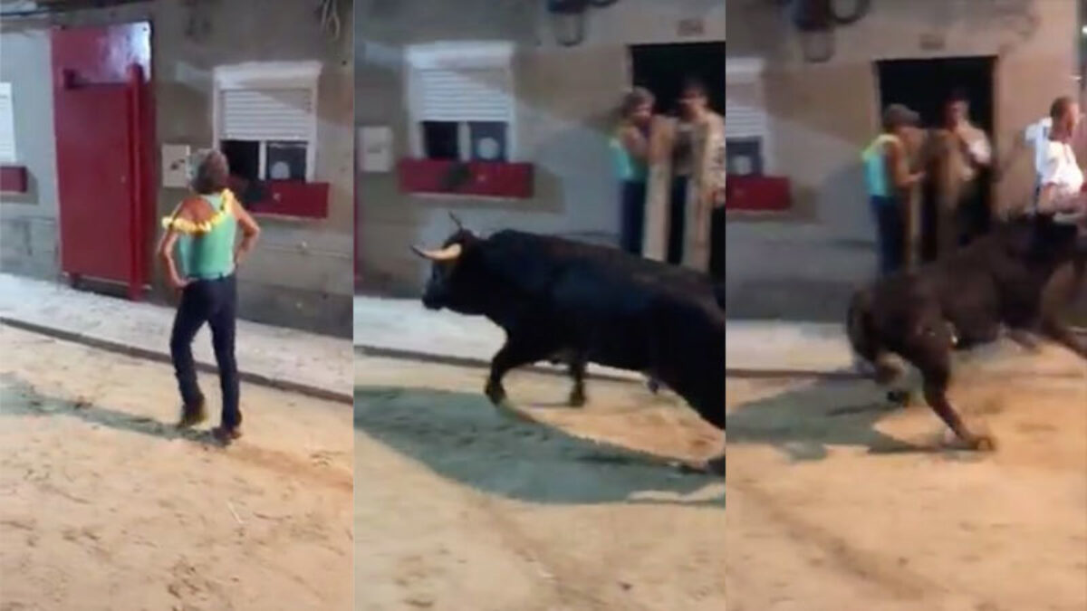 Ontsnapte Portugees wordt door stier hard over hekje terug gebeukt