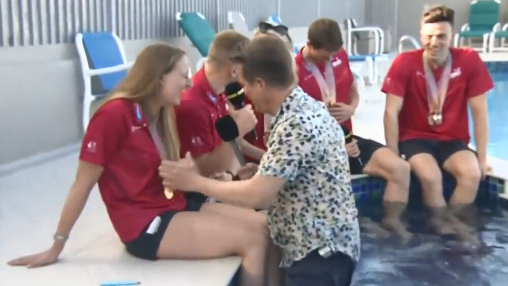 Iedereen, maar dan ook echt iedereen ziet al van mijlenver aankomen wat er gaat gebeuren als een BBC-verslaggever een zwembad instapt tijdens de Commonwealth Games van 2018. Plons 💦