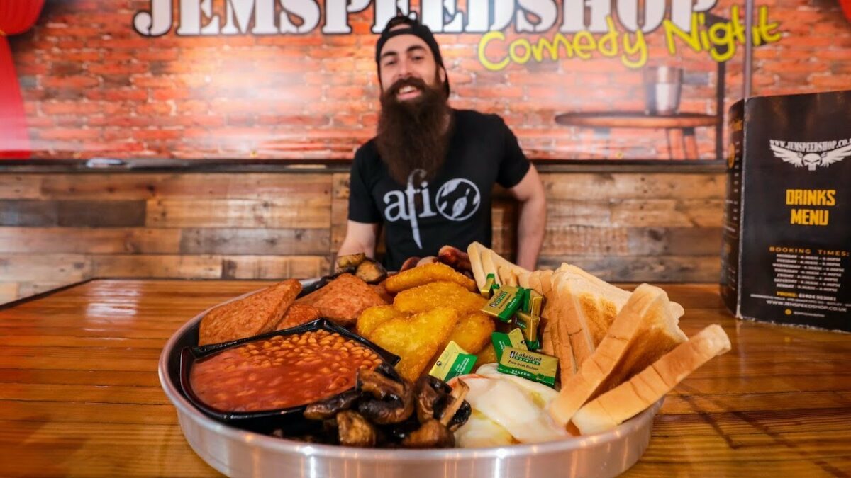 Schriele wedstrijdeter BeardMeatsFood is vandaag extra vroeg opgestaan zodat hij een heerlijk Engels ontbijtje naar binnen kan schrokken. Waar laat hij het in Godsnaam?