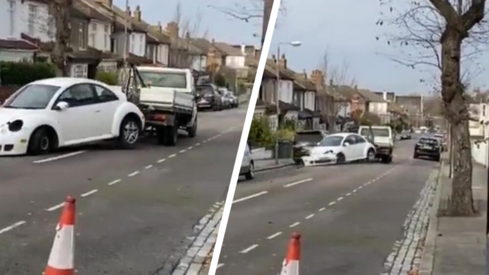 Is de bestuurder van deze sleepwagen in Londen dronken? Of gaat hier gewoon iets heel anders mis? Hoe dan ook, goede zaken voor de lokale garage want de schade lijkt behoorlijk op te lopen.