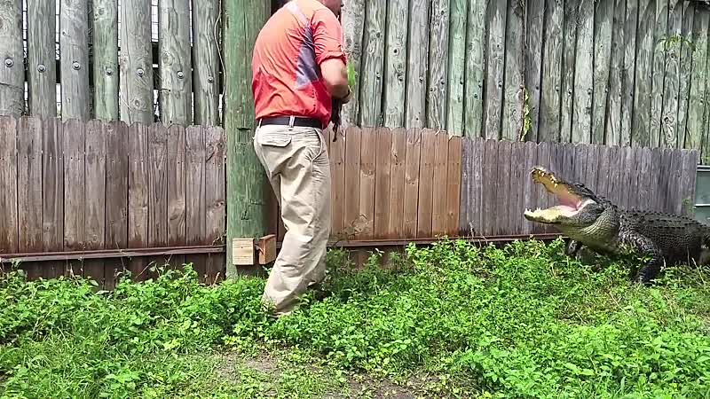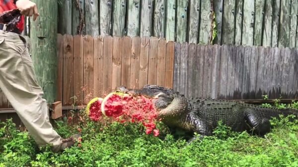 Vegan alligator verplettert watermeloenen met zijn grote smoel