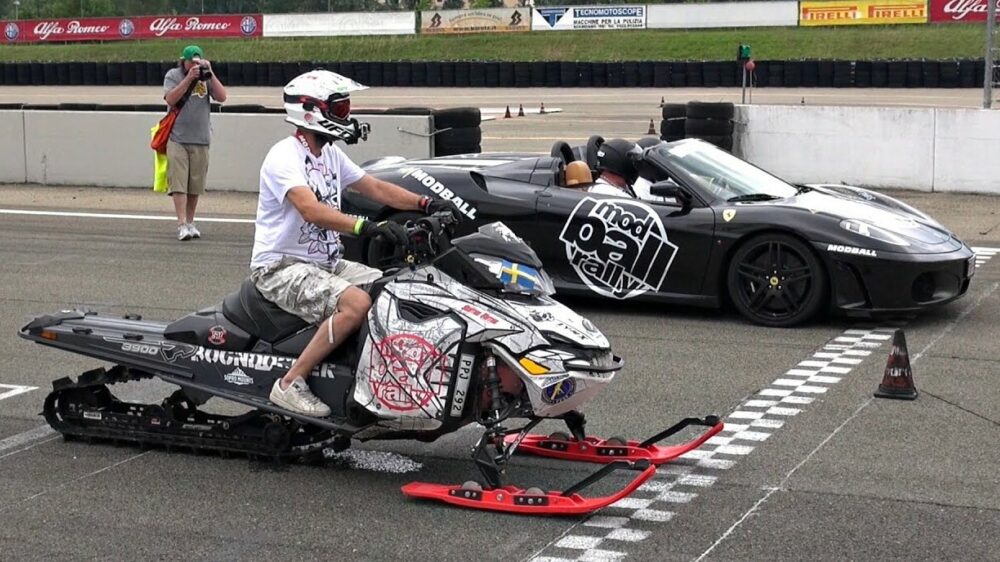 Tijdens Modball Rally 2015 op het Varano de Melegari-circuit in Italië houdt een verdwaalde sneeuwscooter een dragrace tegen een Ferrari F430 Spider en een Ferrari 458 Spider! Sta je dan, met je veel te dure bolide die in de sneeuw nog eens niet vooruitkomt.