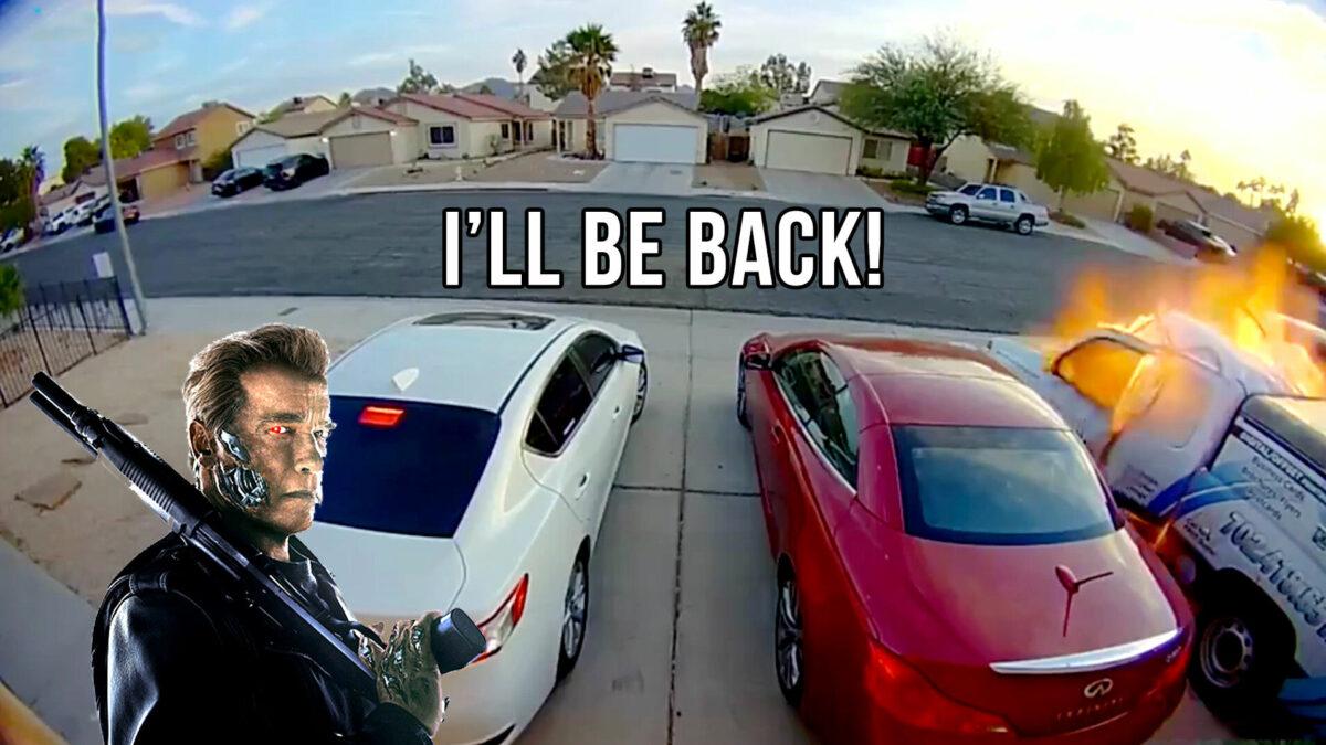 Propaantank veroorzaakt dikke explosie in auto, bestuurder blijkt Terminator te zijn