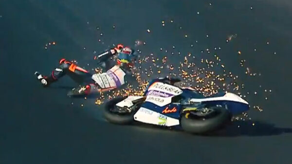 Dit mogen we wel het close call-momentje van de maand noemen; de 21-jarige Spanjaard ging afgelopen weekend onderuit tijdens het raceweekend in Portimão en weet op het nippertje alle aanstormende coureurs te ontwijken.