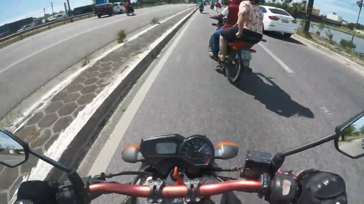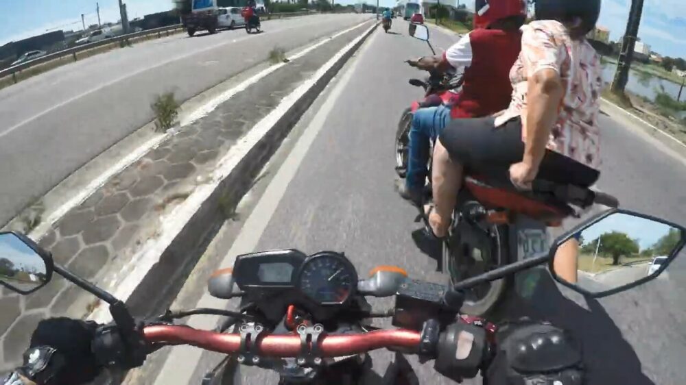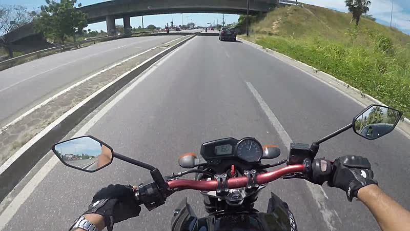 Gelukkig heeft hij zijn beschermende motorpak aangetrokken, want je weet tenslotte nooit of je plotseling moet uitwijken en over het asfalt buikschuift...