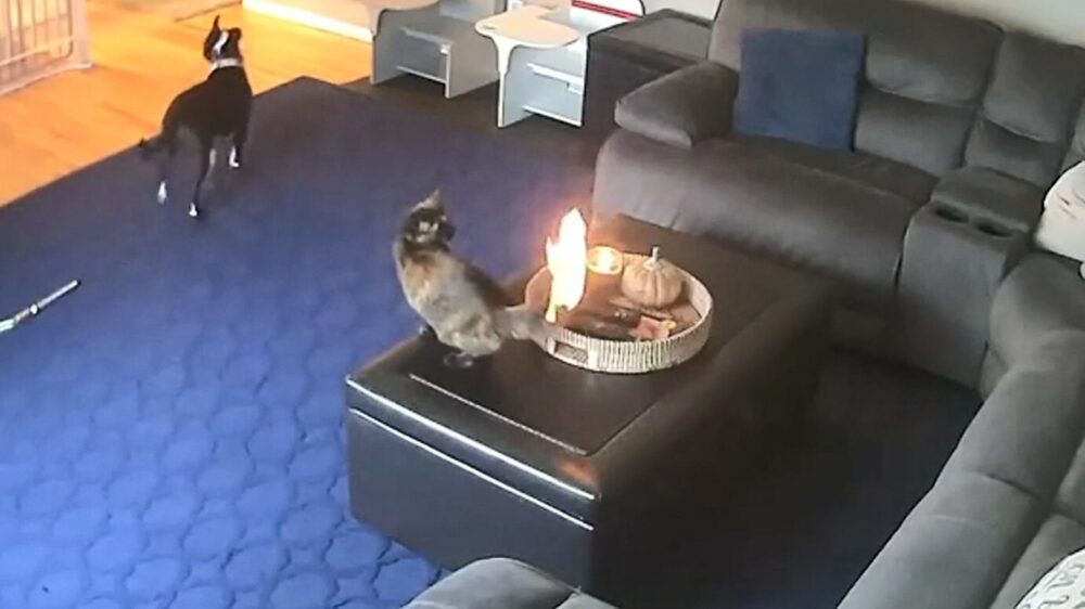 Een brandende kaars kan gevaarlijk zijn voor katten, maar niet dat Felix zich hier ook maar iets van aantrekt.