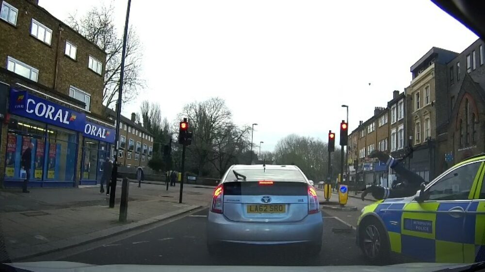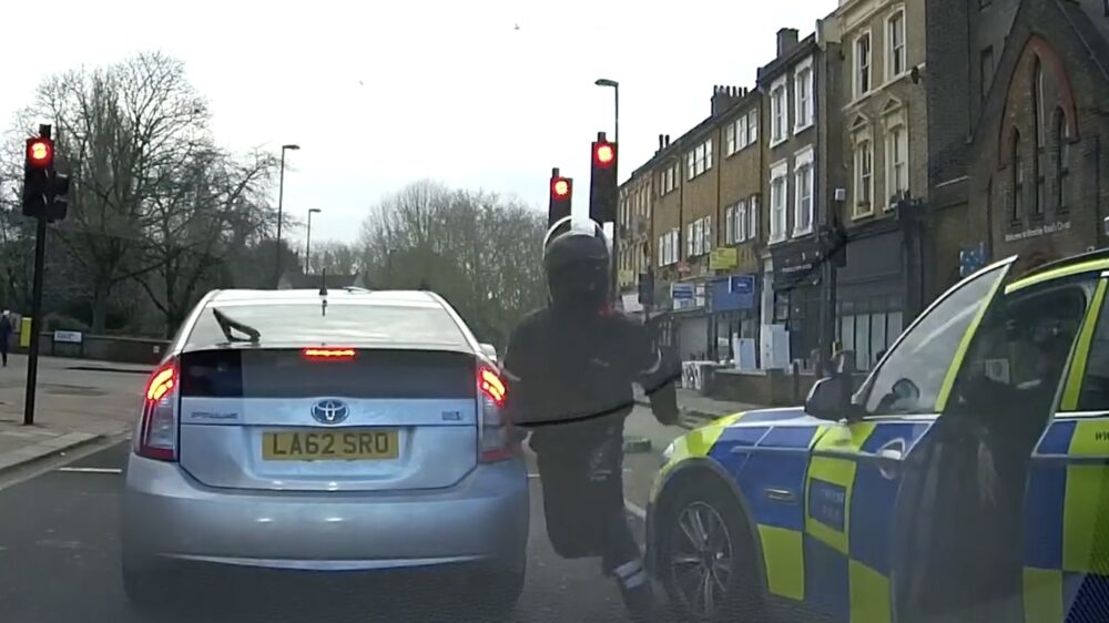 Er is niet bekend waarom de coppers achter hem aanzitten, maar we hebben wel het belangrijkste mogen aanschouwen. Trouwens best knap hoe snel hij op de benen is na zo'n klapper.