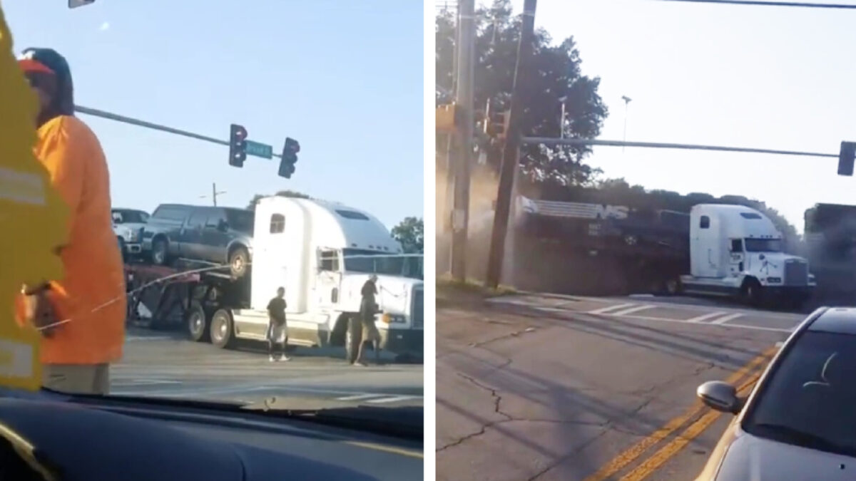 Oude doos: aanstormende trein beukt zich een weg door aanhanger vol auto's