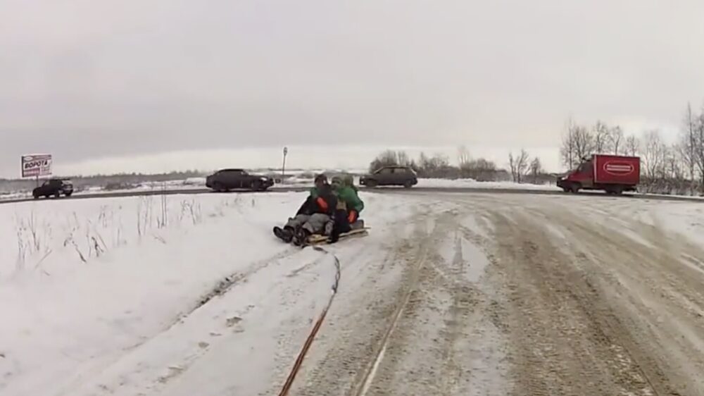 Boris en Pavel hebben sloopkogels van staal, want anders zou je niet op een sleetje achter de auto van een Rus gaan hangen 😱
