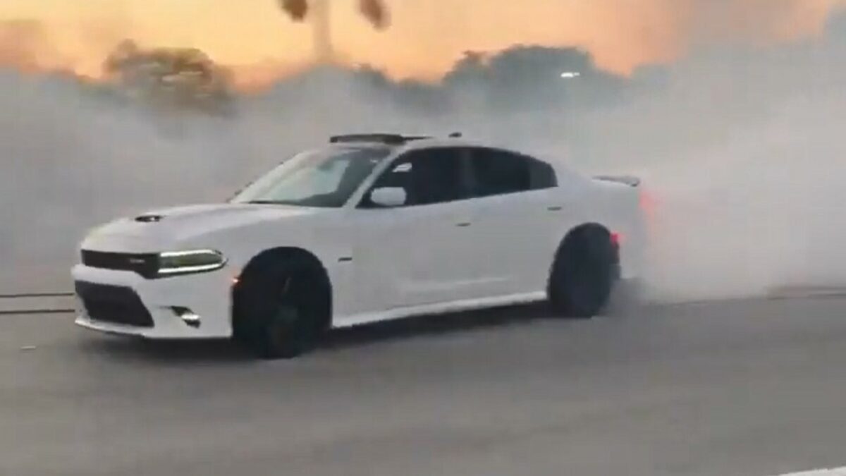 Uitslover in Dodge Charger krijgt een verrassing nadat hij dikke donuts draait